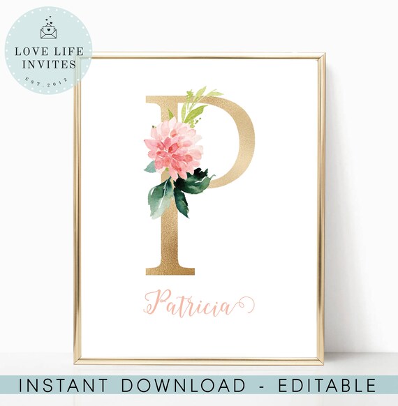 Letter P Nursery Wall Art Floral Letter Baby Name Sign For Nursery Editable Nursery Wall Decor Gold Printable Baby Room Instant Download