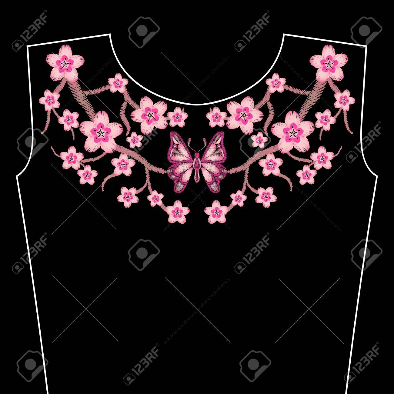 Embroidery Stitches With Spring Sakura Flowers Branch Of Japanese